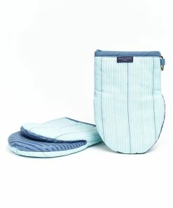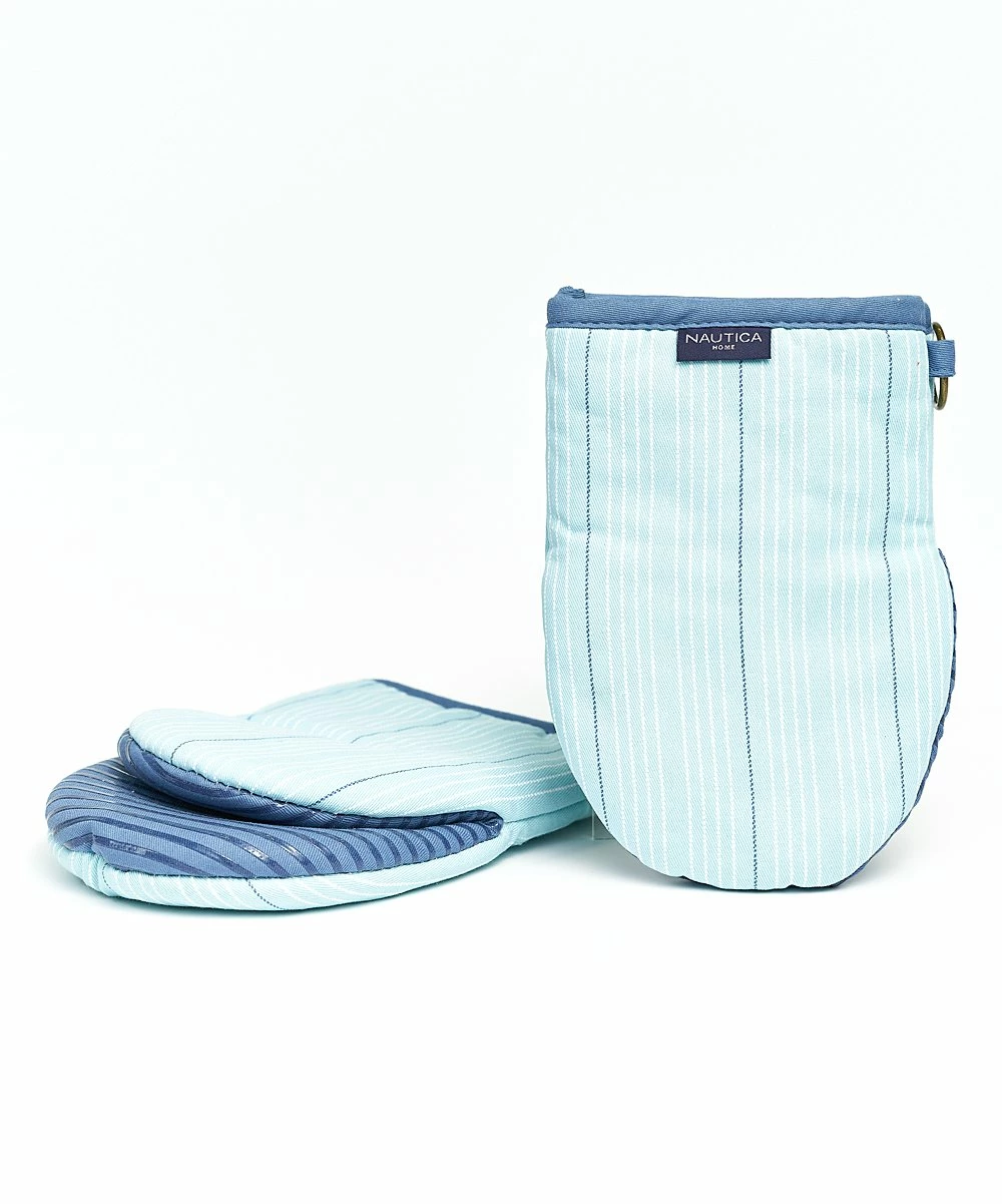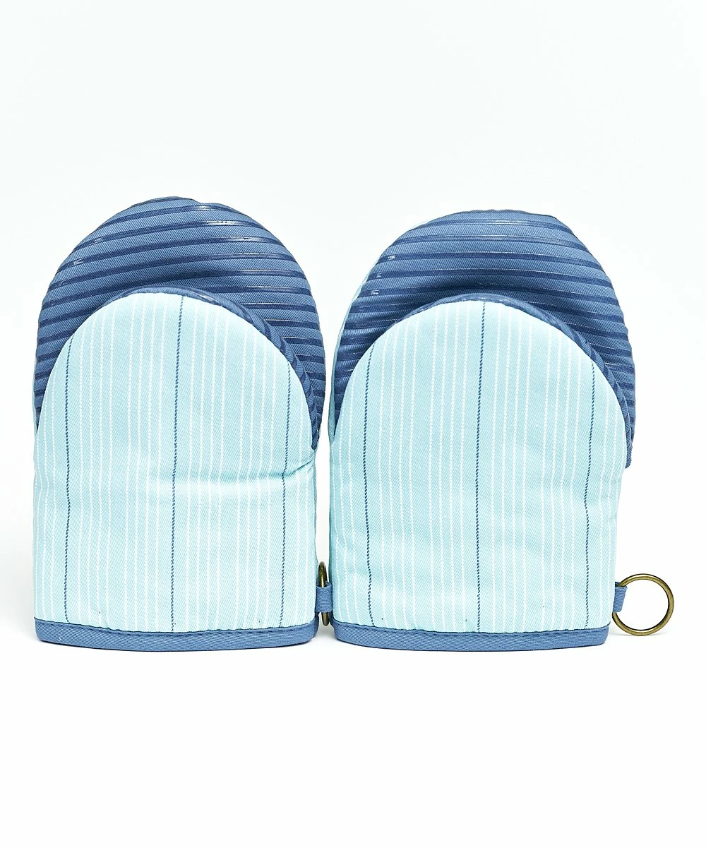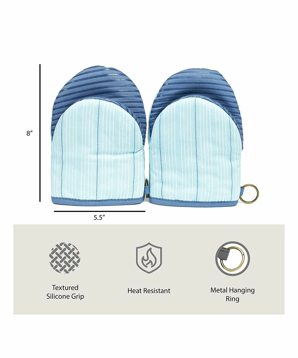 - Includes two aqua stripe oven mitts