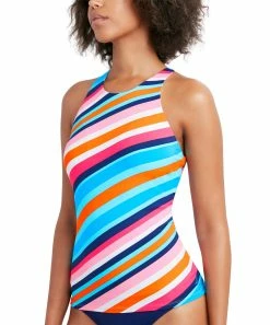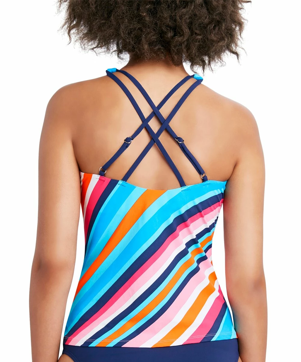 Make a splash poolside with this high-neck tankini top featuring a colorful stripe print and stretch-infused fabric.