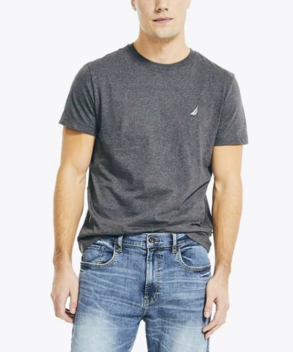 He complements his casual outfits with this tee that features a versatile solid hue and is crafted from comfortable cotton.
