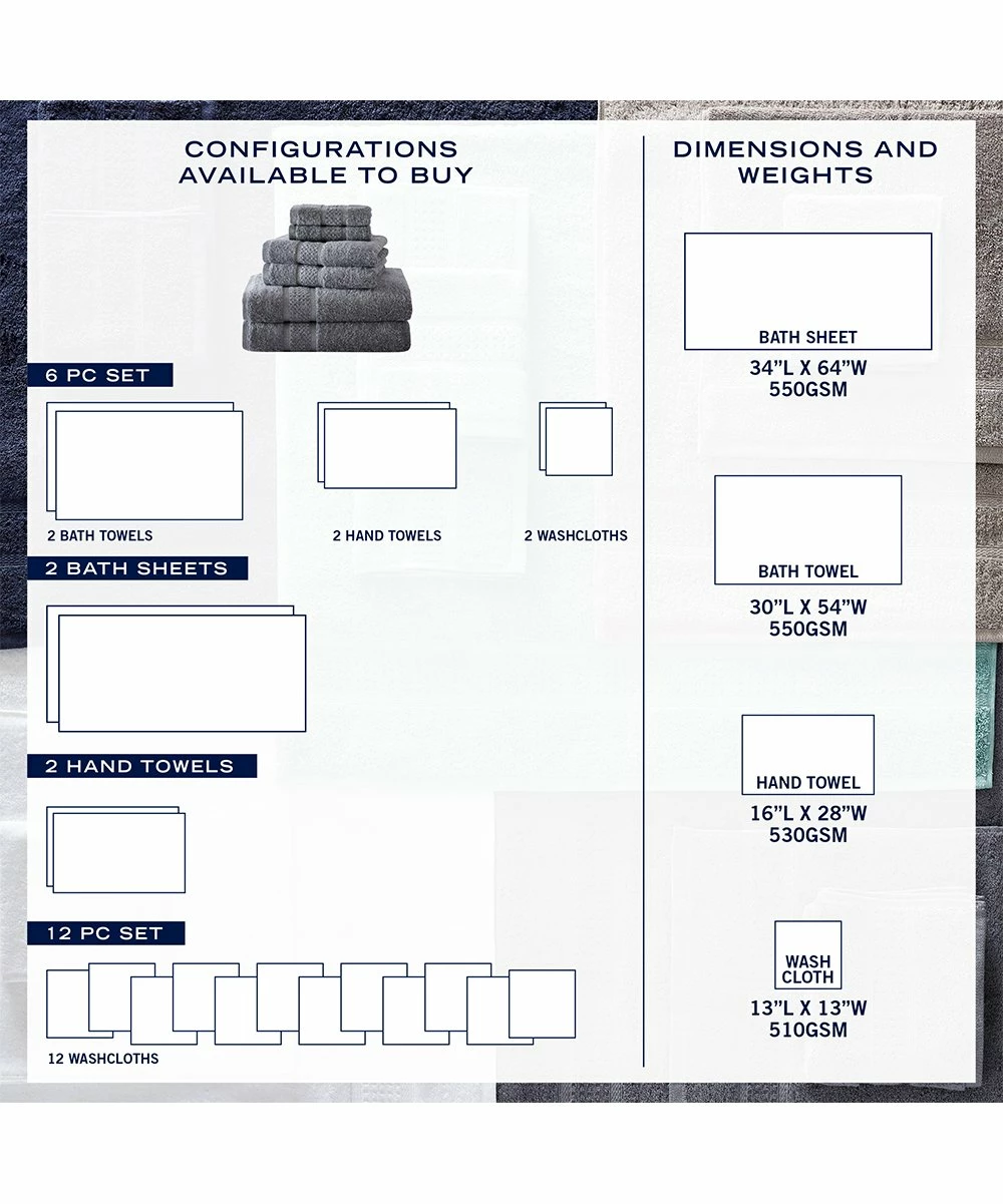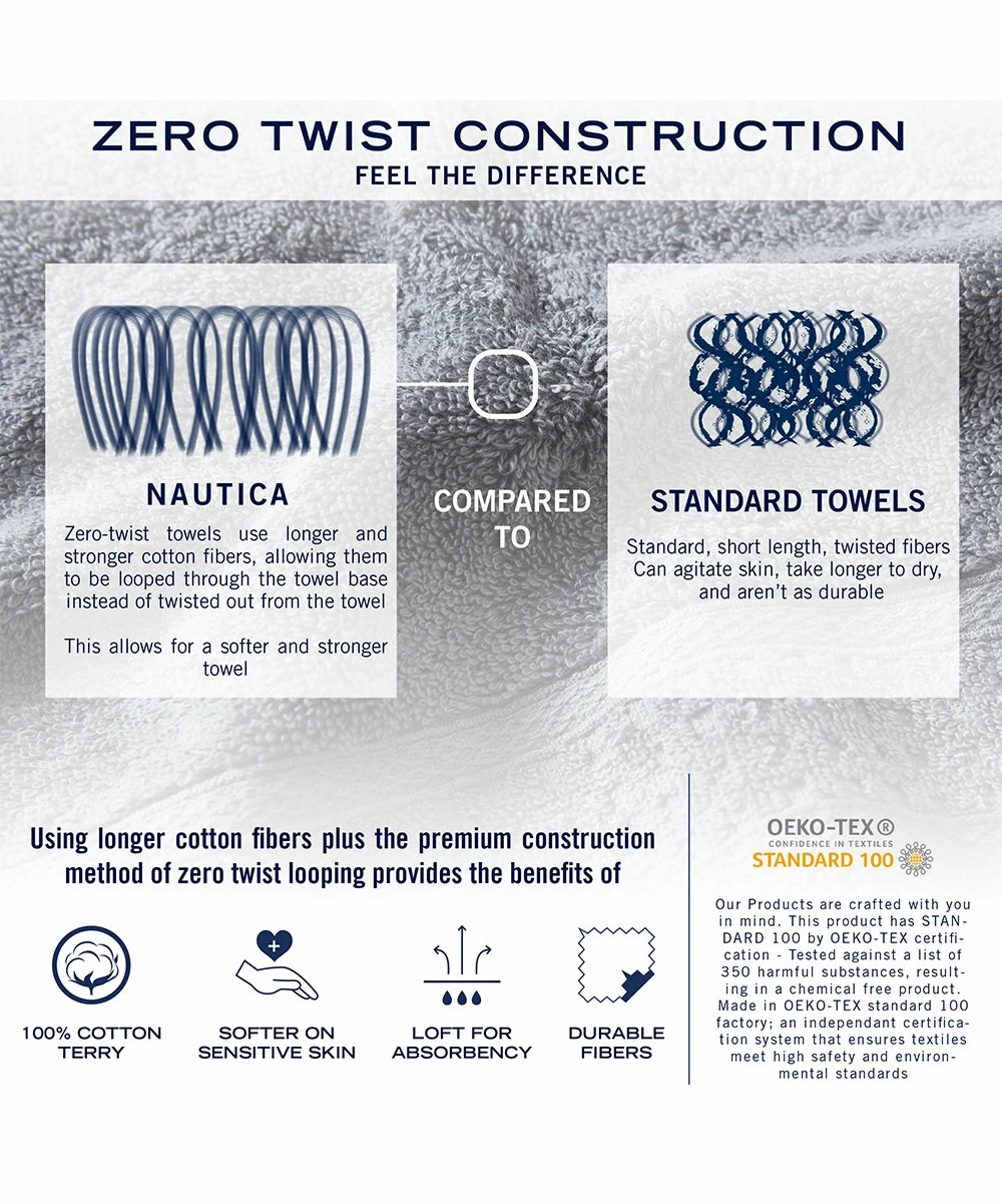 Absorbent terry cotton bath towels made from zero-twist construction for an ultrasoft touch. Durable fibers help to reduce lint.