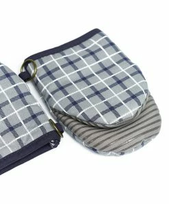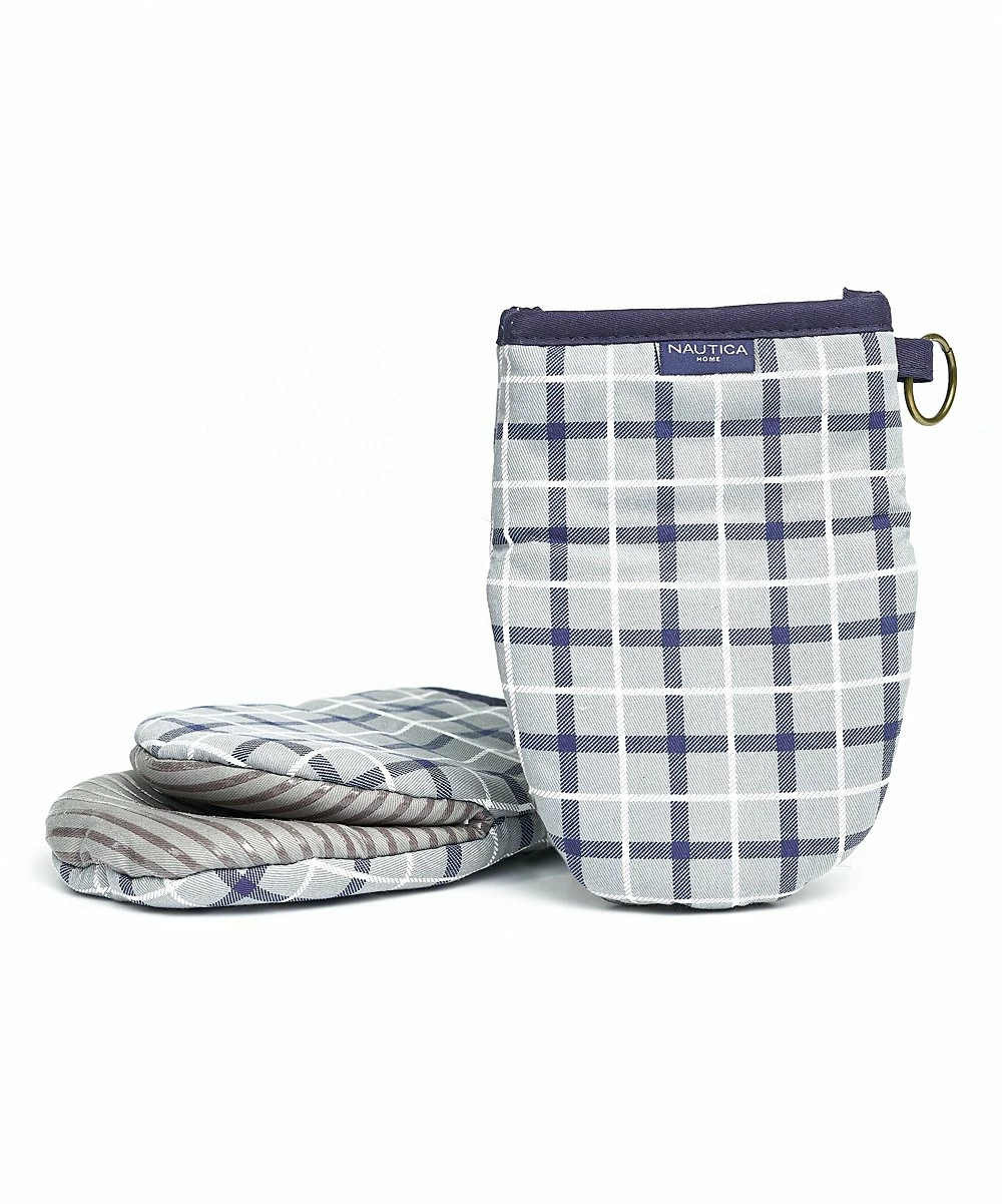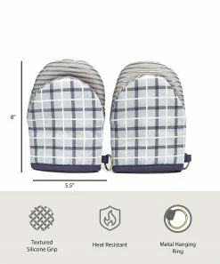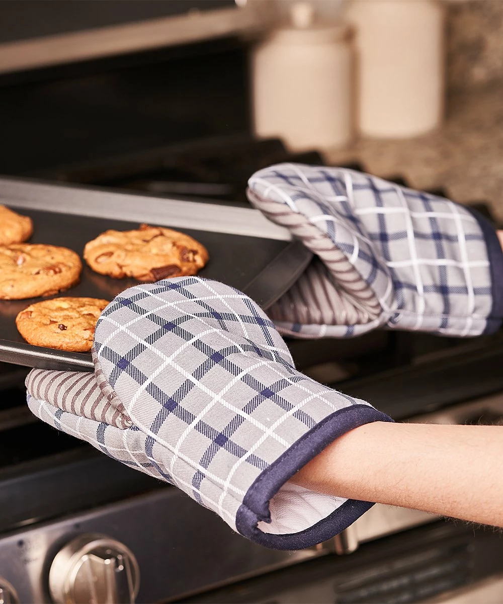 - Includes two gray and navy plaid stripe oven mitts