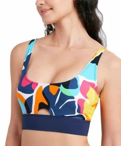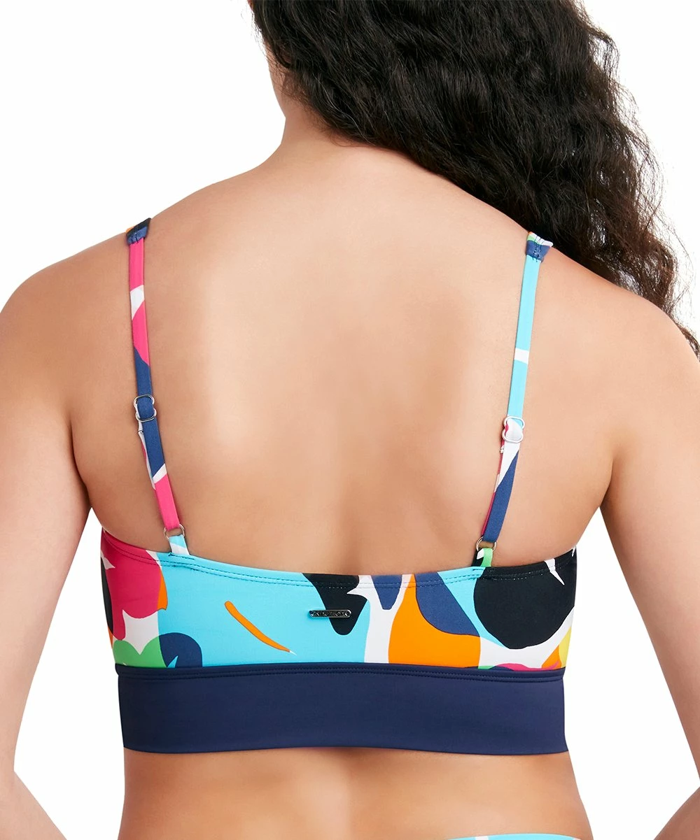 Make a splash poolside with this bikini top featuring a colorful abstract print and stretch-infused fabric.