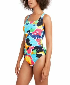 Make a splash poolside with this one-piece swimsuit featuring a colorful abstract print and stretch-infused fabric.