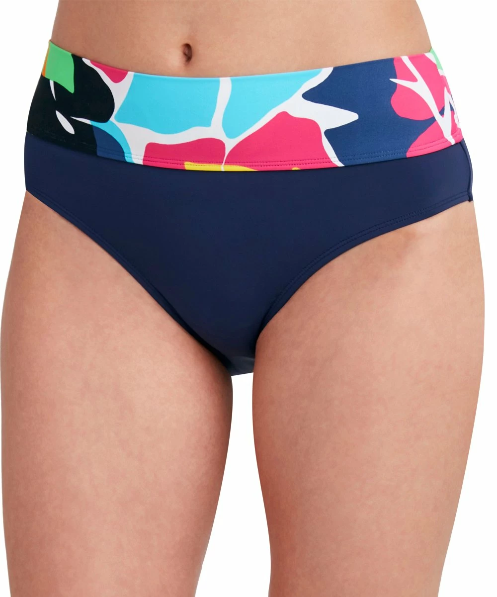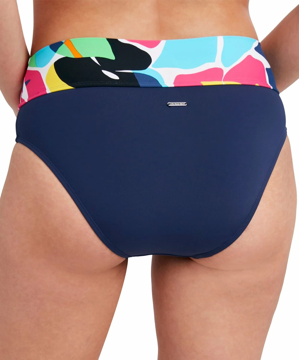 Make a splash poolside with these high-waist bikini bottoms featuring a colorful abstract print and stretch-infused fabric.