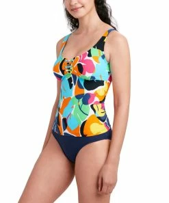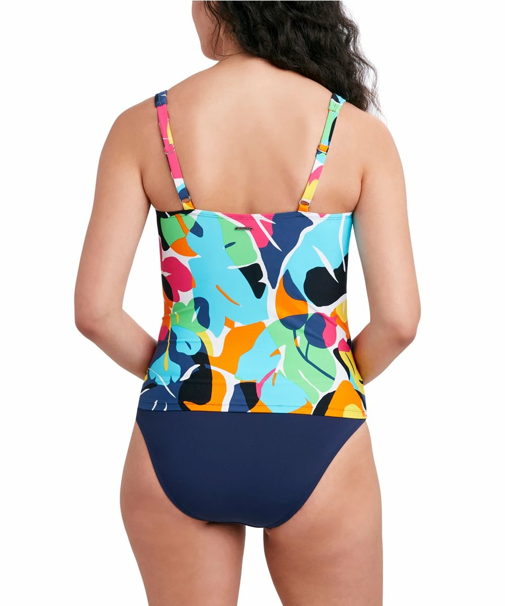 Make a splash poolside with this scoop-neck tankini top featuring a colorful abstract print and stretch-infused fabric.
