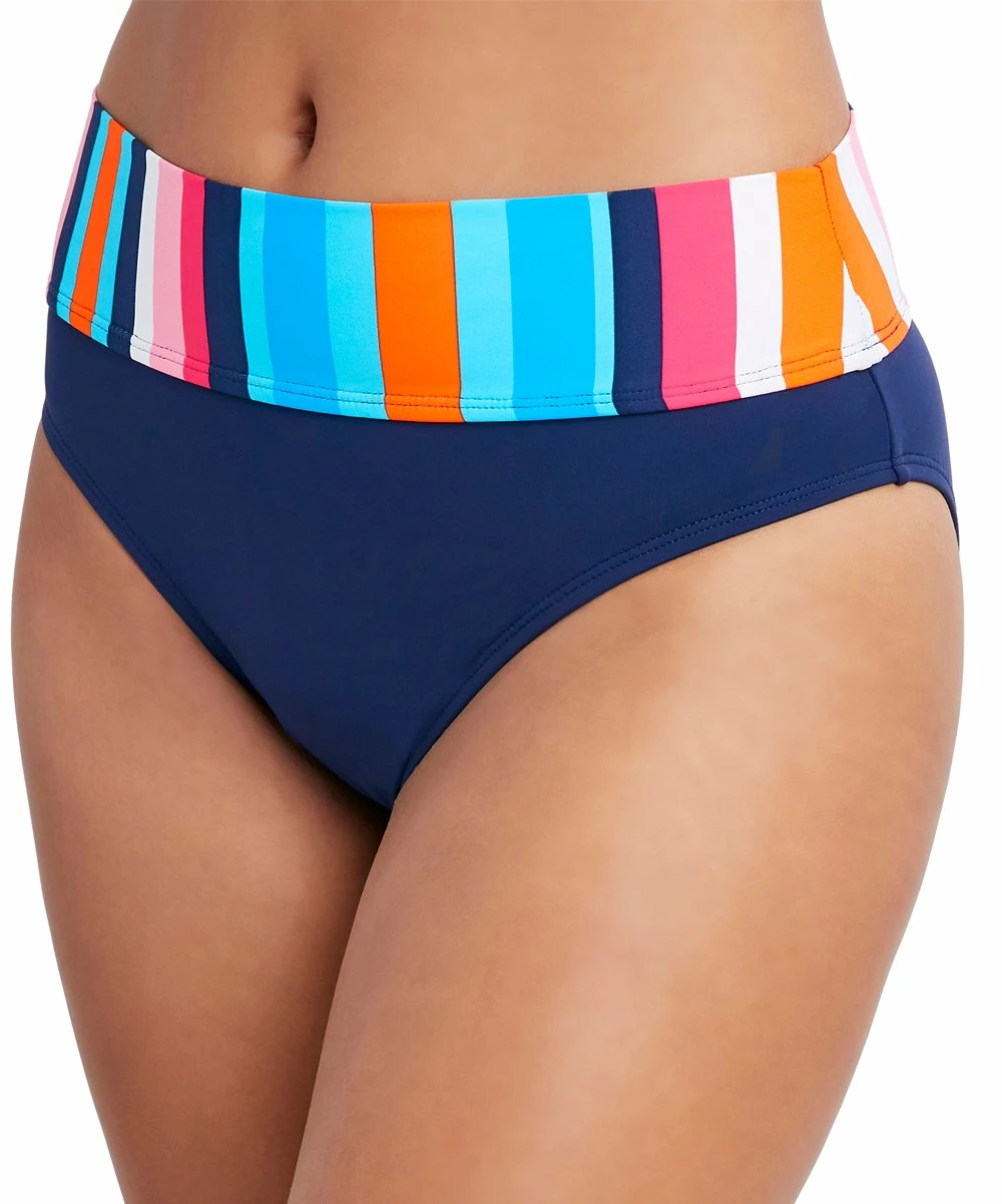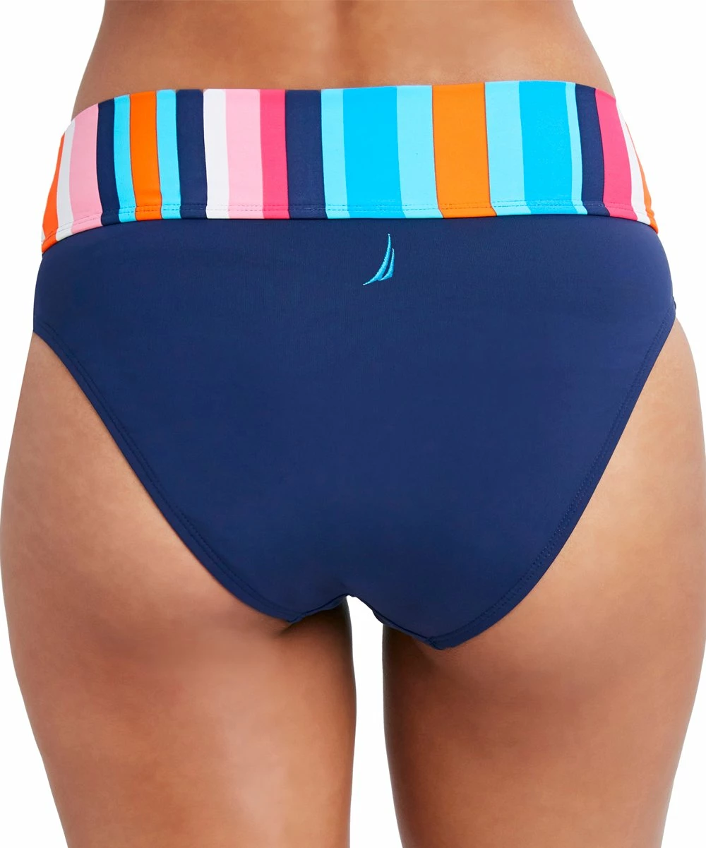 Make a splash poolside with these mid-rise bikini bottoms featuring a colorful stripe print and stretch-infused fabric.