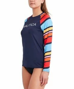 Get ready to make a splash in this rashguard that features a flexible fit and a colorful stripe motif.