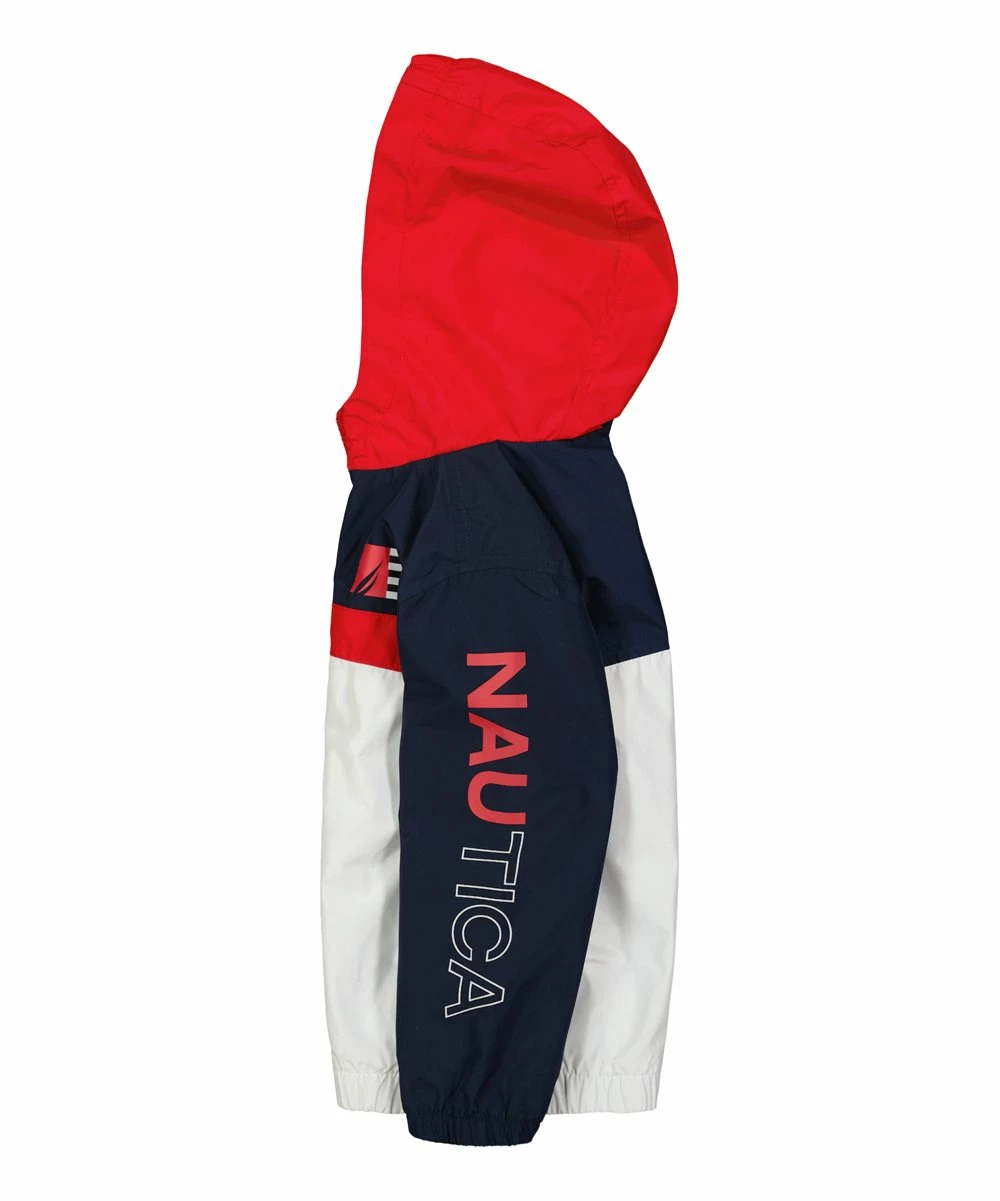 - Includes one red and white color block full-zip hooded jacket, one red tee and one tan pair of pants (three pieces total)