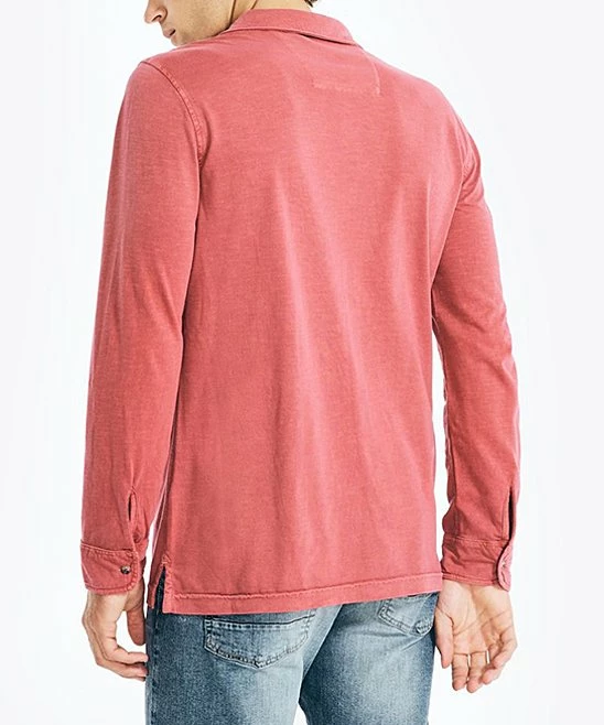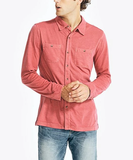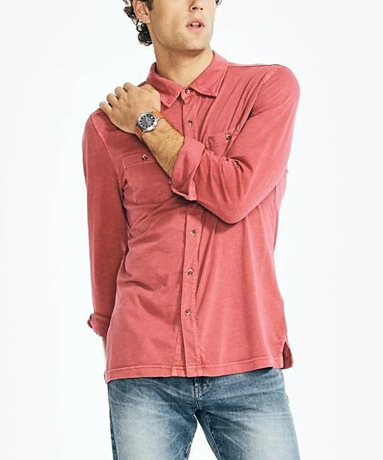 Reach for this breathable soft cotton-blend shirt with a button collar and front pockets for those slightly cool days.