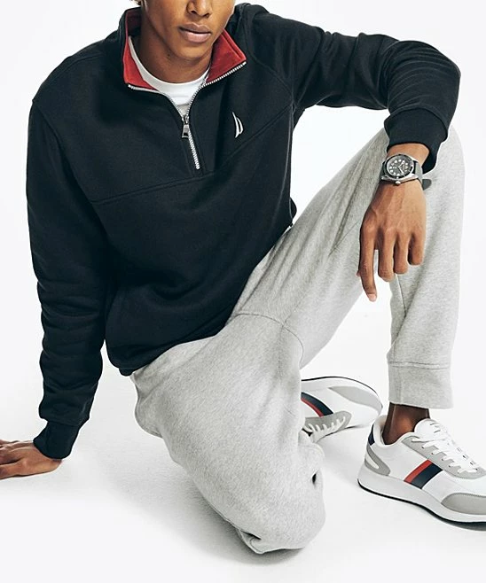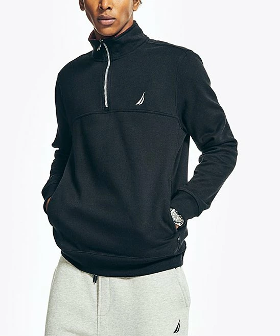 Featuring a soft cotton-bled knit fabric and mock neck collar, this fleece quarter-zip pullover is the ideal transitional piece to chillier weather.